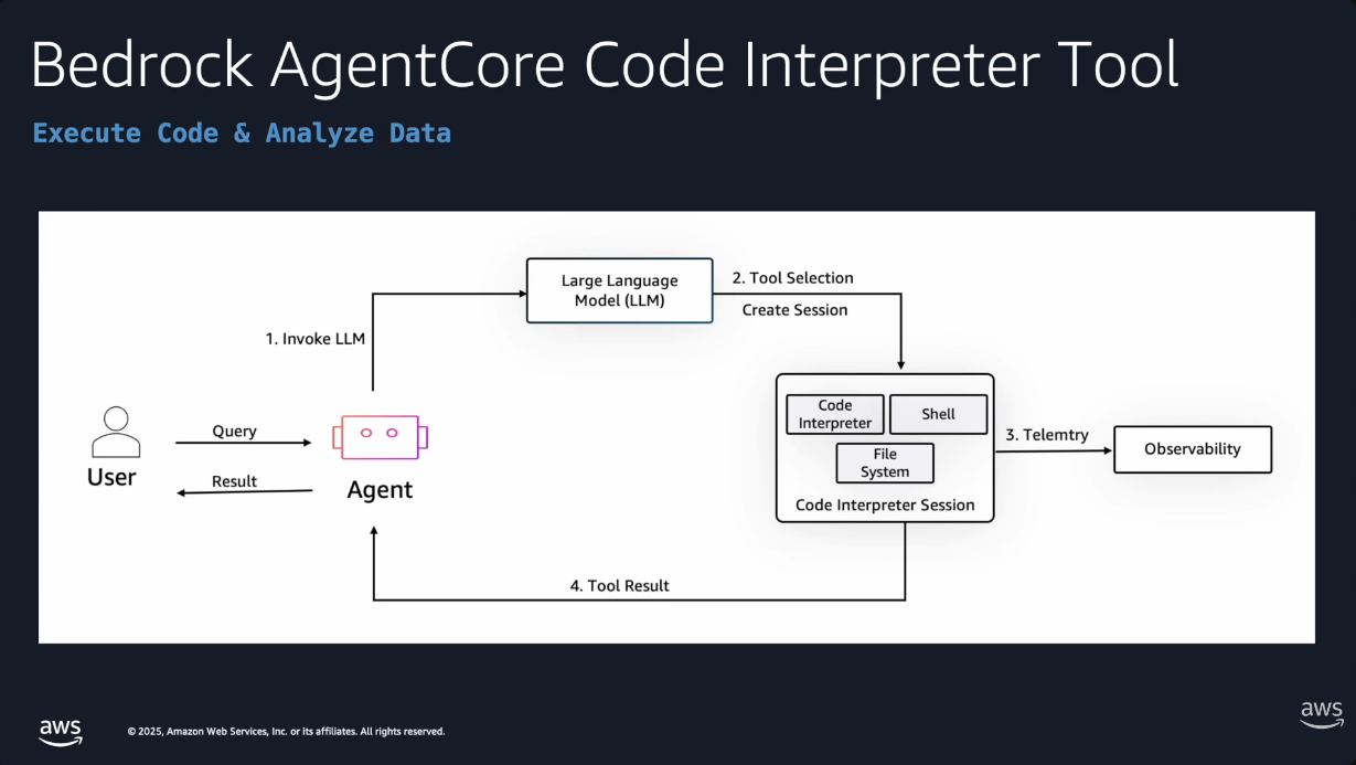 Joshua Emmanuel Santiago2025-11-25T03:31:38+00:00Bookmarks Features Use Cases Implementation Security Best Practices Pricing A specialized tool that enables AI agents to write, execute, and debug Python code in a secure sandboxed environment for data analysis, mathematical computations, and file processing tasks. Amazon Bedrock AgentCore Code Interpreter Features Secure Code Execution The Code Interpreter runs Python code in an isolated sandbox environment with no external network access. It includes popular data science libraries like pandas, numpy, and matplotlib for comprehensive analysis. The environment automatically manages memory and computational resources to ensure safe operation. File [...]