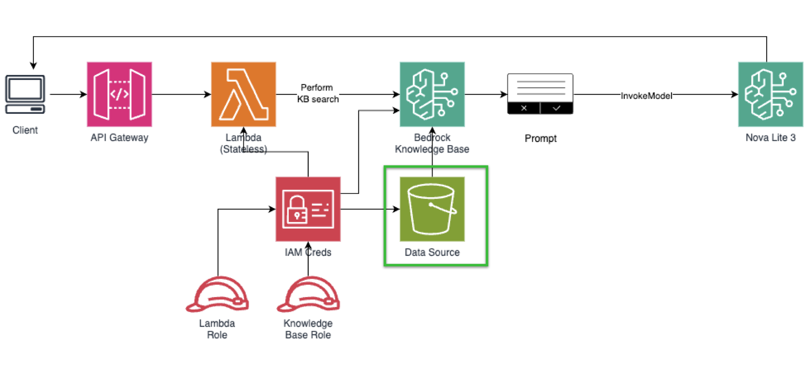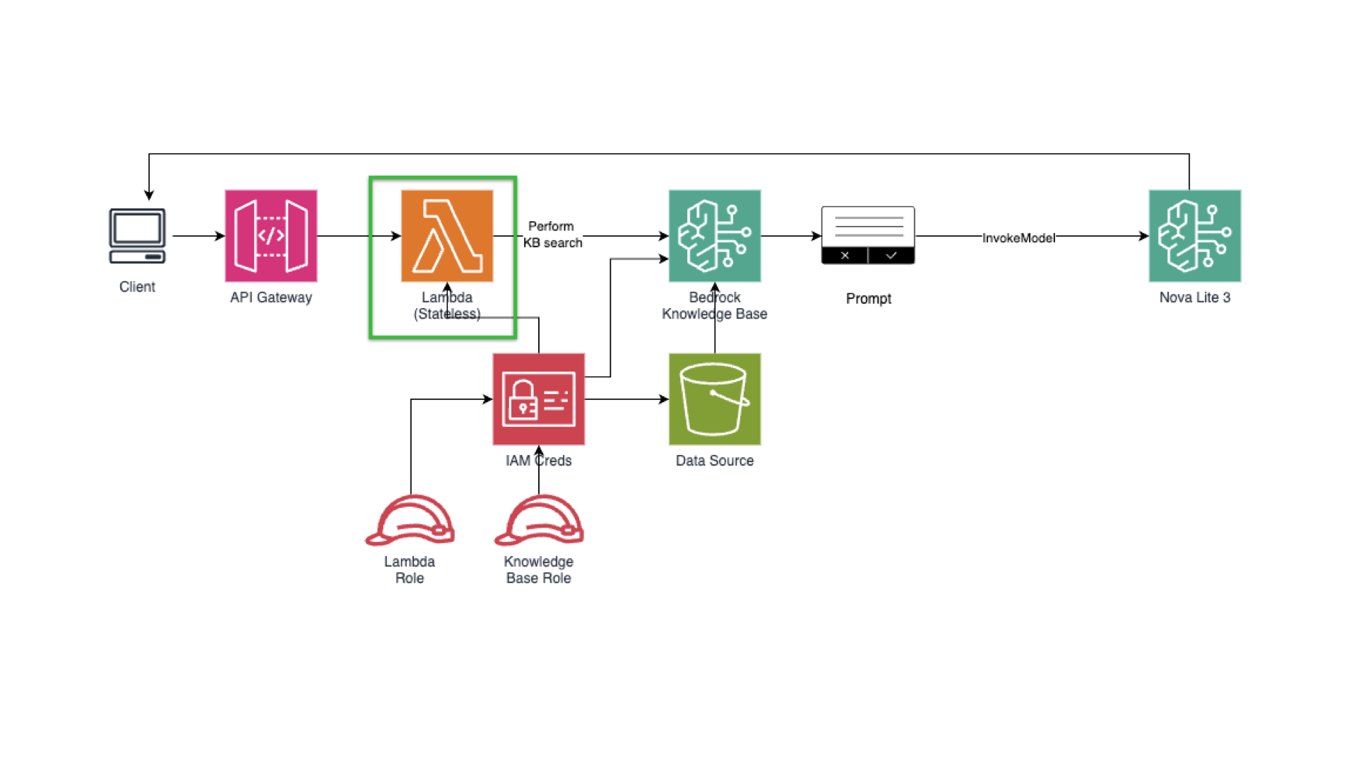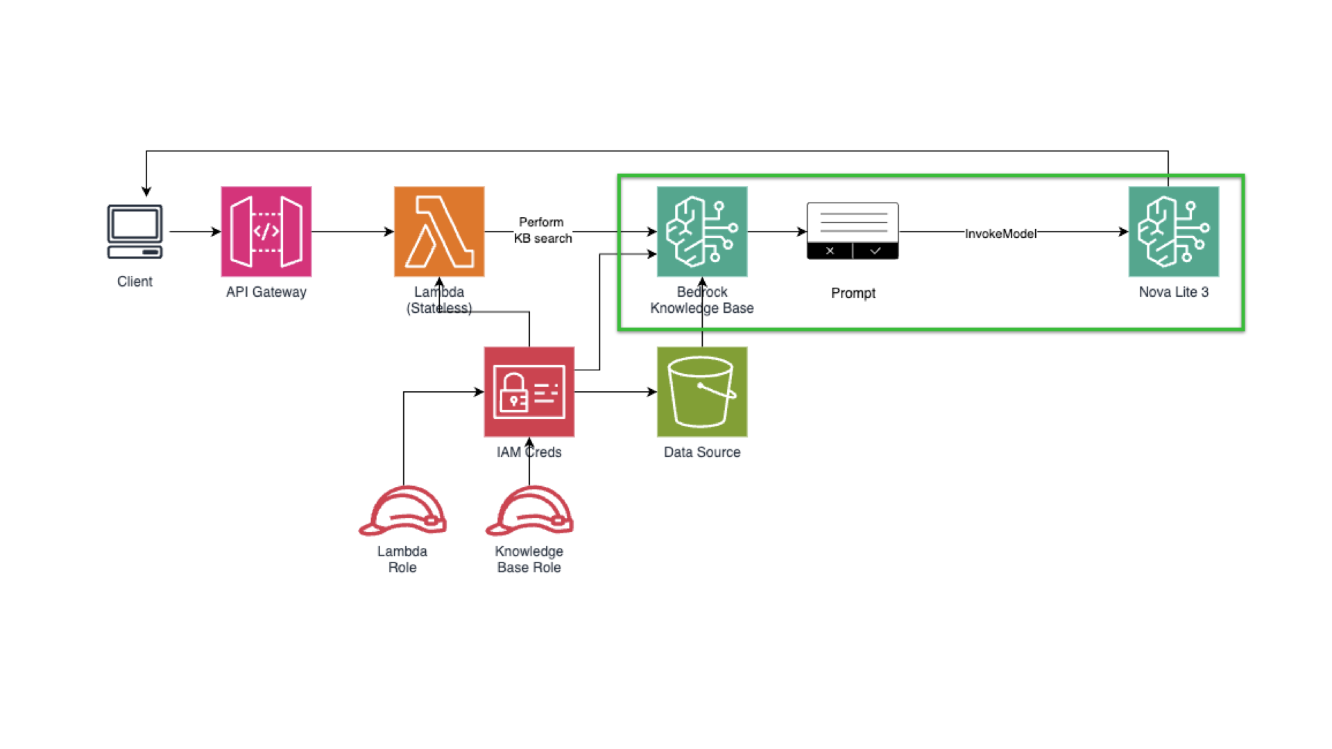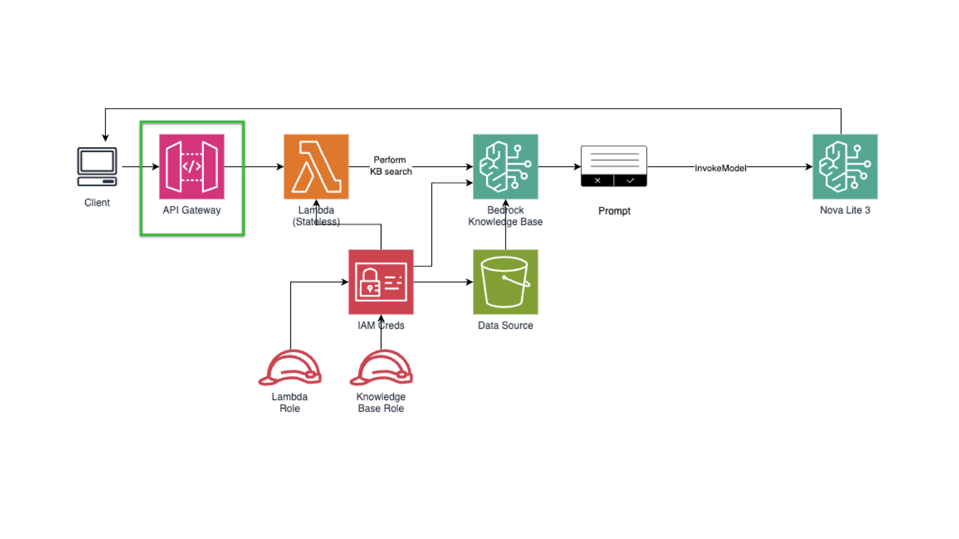 Client → API Gateway → Lambda → (1) bedrock:Retrieve (KB search) → (2) bedrock:InvokeModel (Nova Lite) → Response.