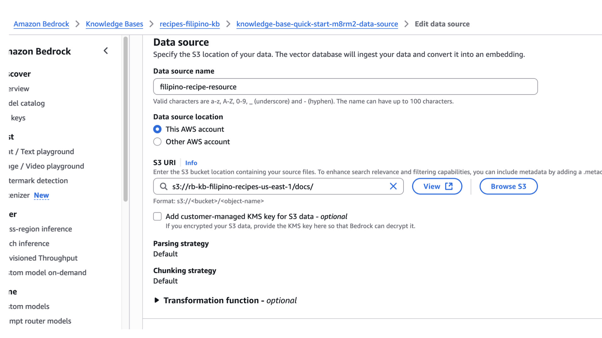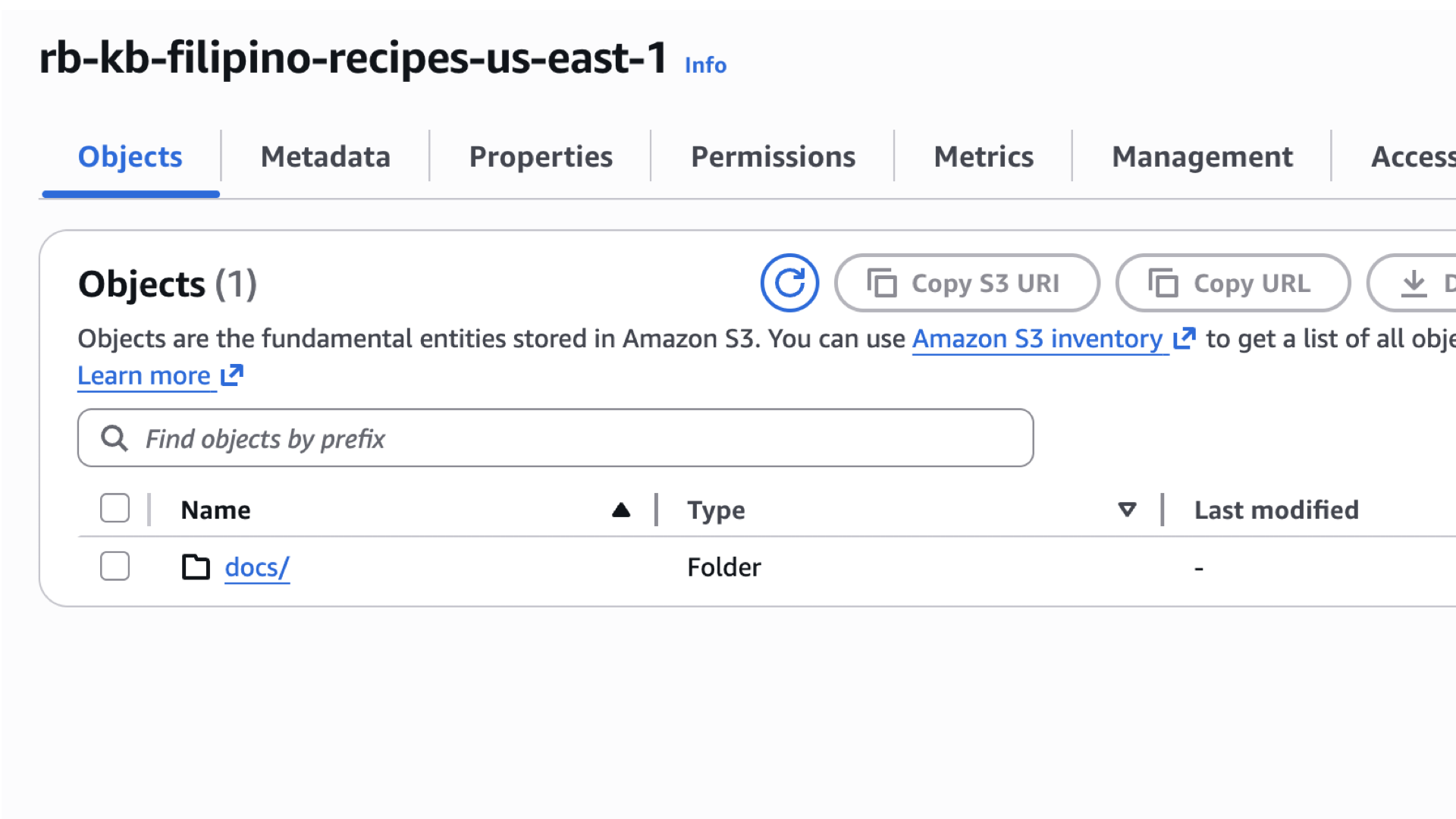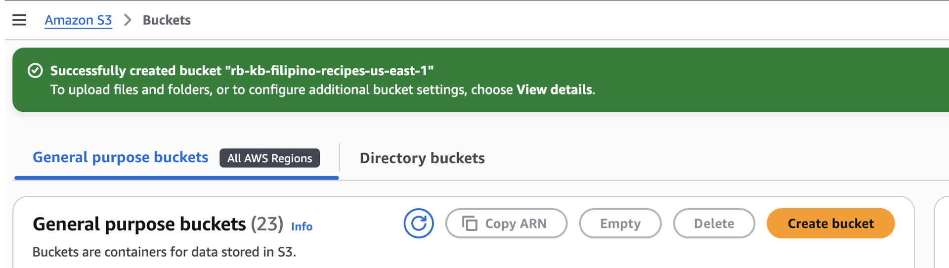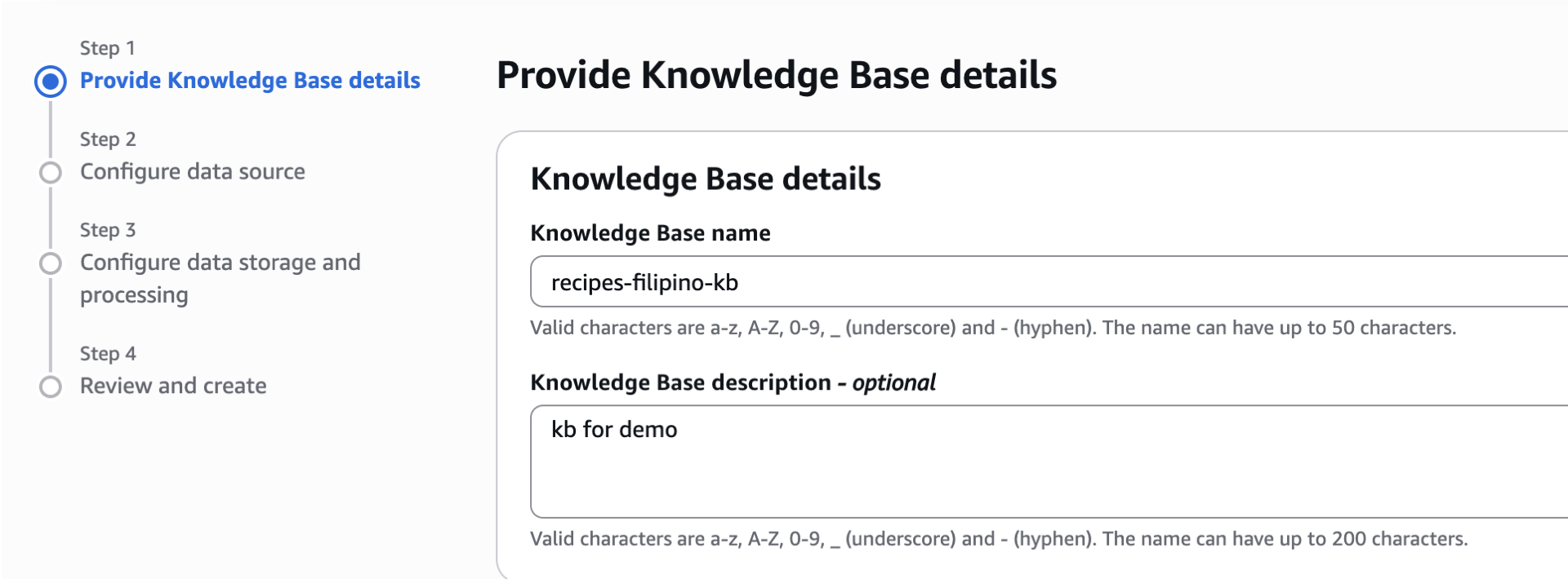 rb-kb-<project>-<region>→rb-kb-filipino-recipes-us-east-1- rb = recipe book