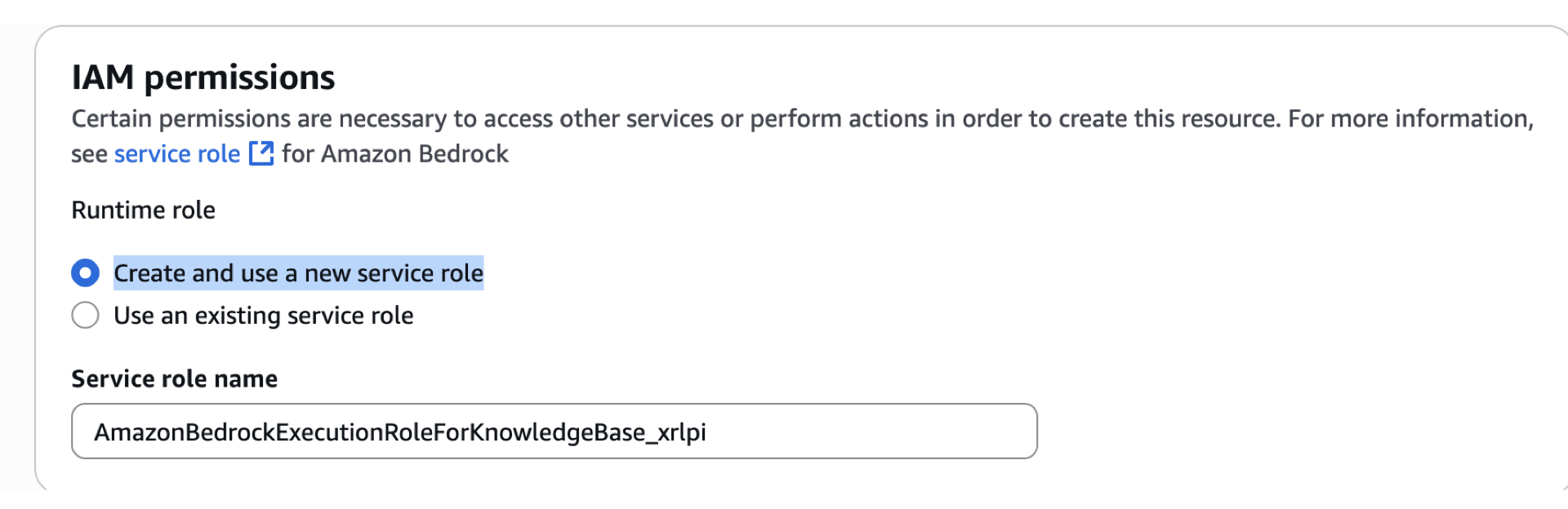 You can let Bedrock auto-create a KB role, but you must add these permissions to the role after creation (or create the role yourself and attach them first). Below are the minimal policy snippets you’ll need to paste/edit in the console.