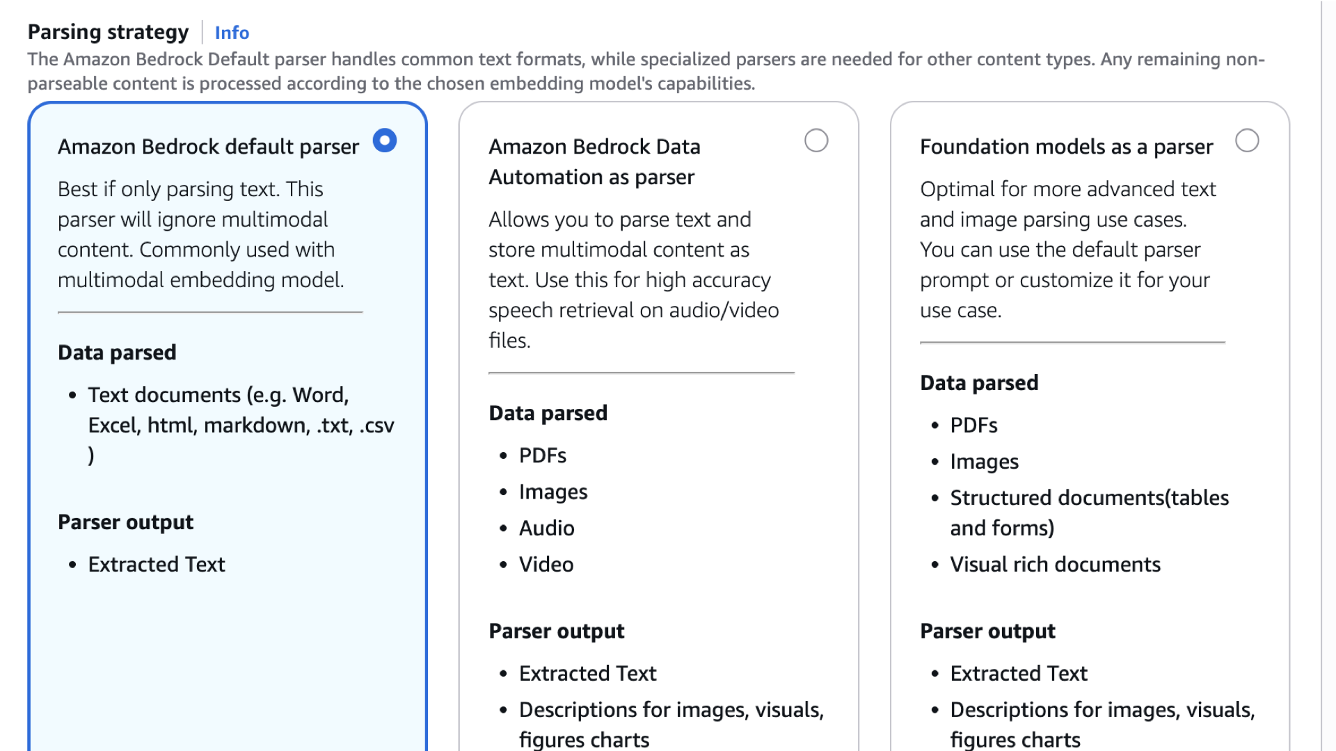 - Ingest and embed Documents – Use Bedrock APIs or console to sync data. Behind the scenes, Bedrock will preprocess each document: splitting it into text chunks, running an embedding model on each chunk, and storing the resulting vectors in a vector store (e.g. an OpenSearch collection) . This ensures your knowledge base has searchable embeddings for all content.