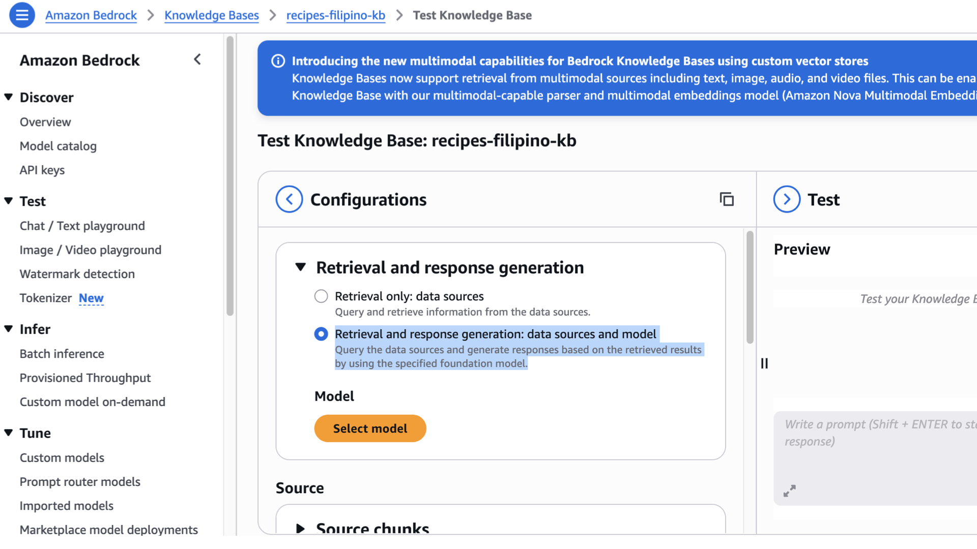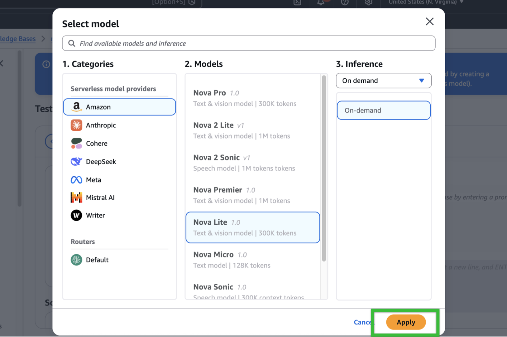 KNOWLEDGE_BASE_ID = "*" MODEL_ARN = "arn:aws:bedrock:us-east-1::foundation-model/amazon.nova-lite-v1:0"