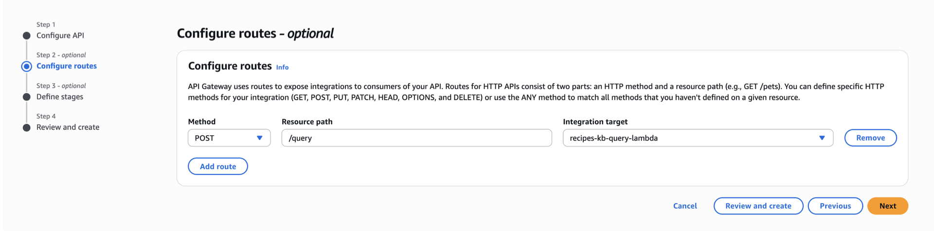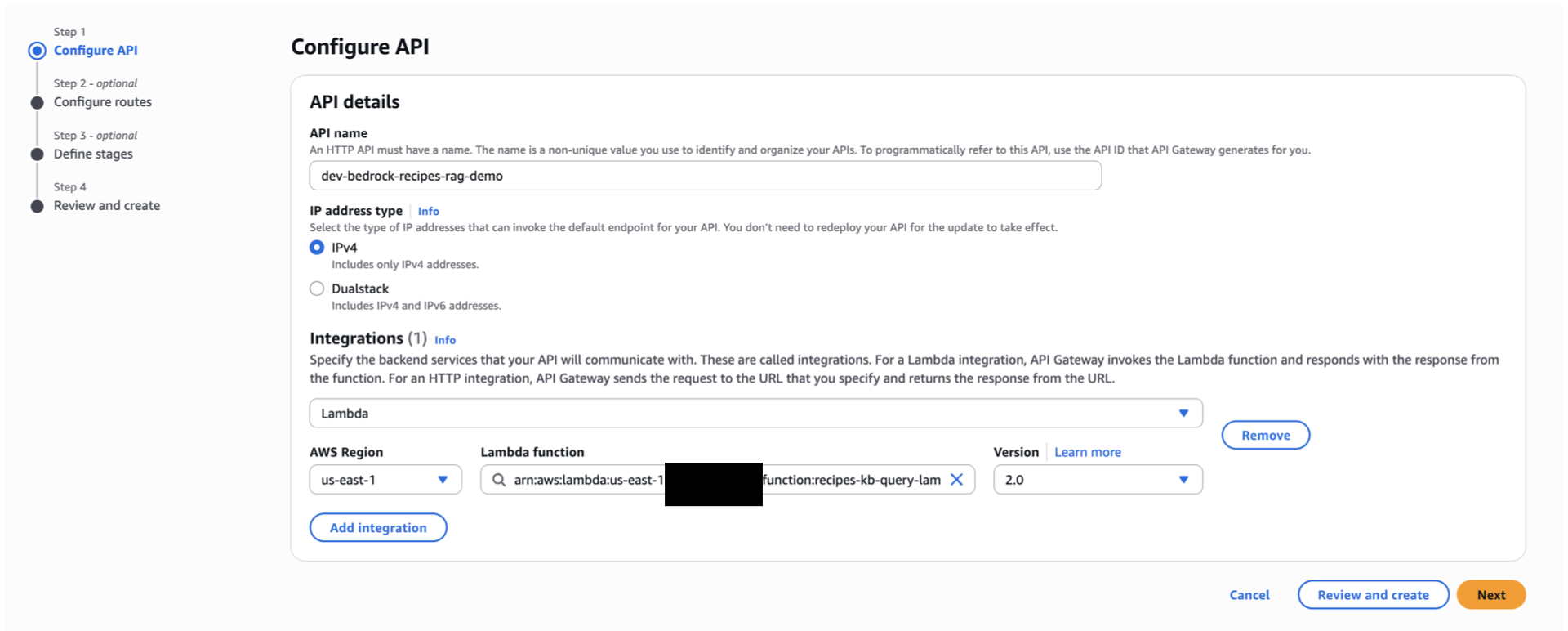 - For the API name, paste what you’ve decided to add earlier, or use `dev-bedrock-recipes-rag-demo`