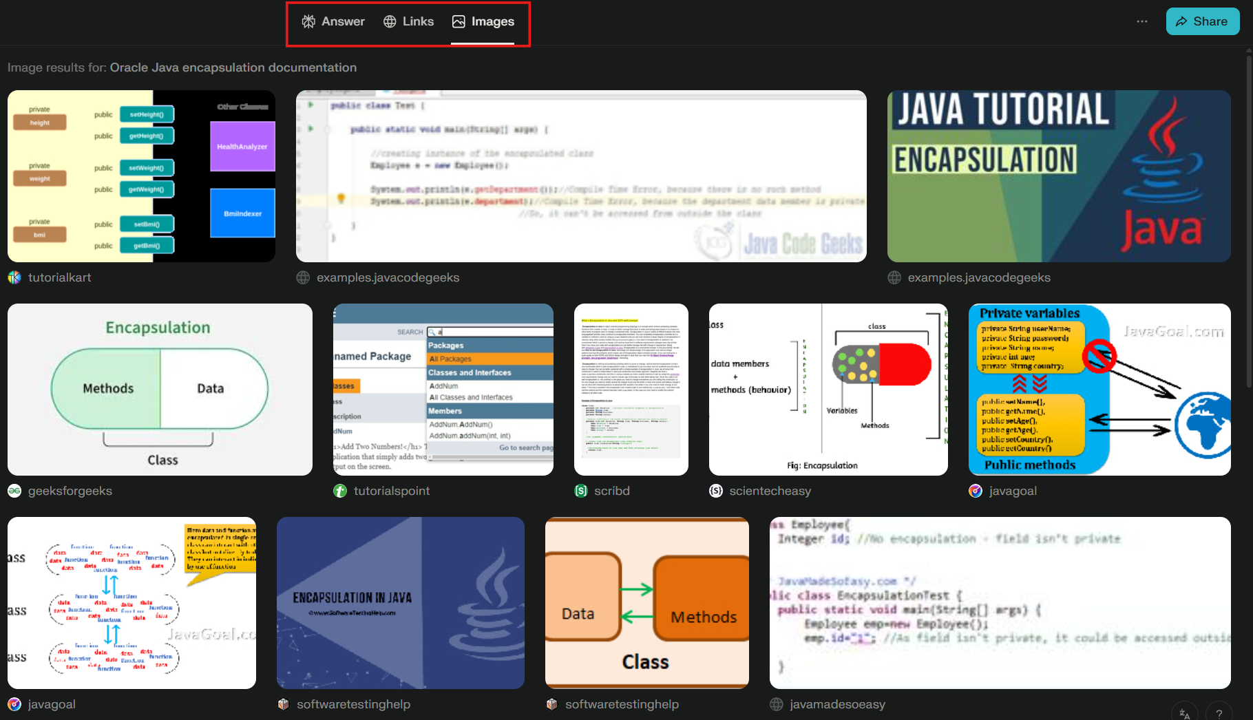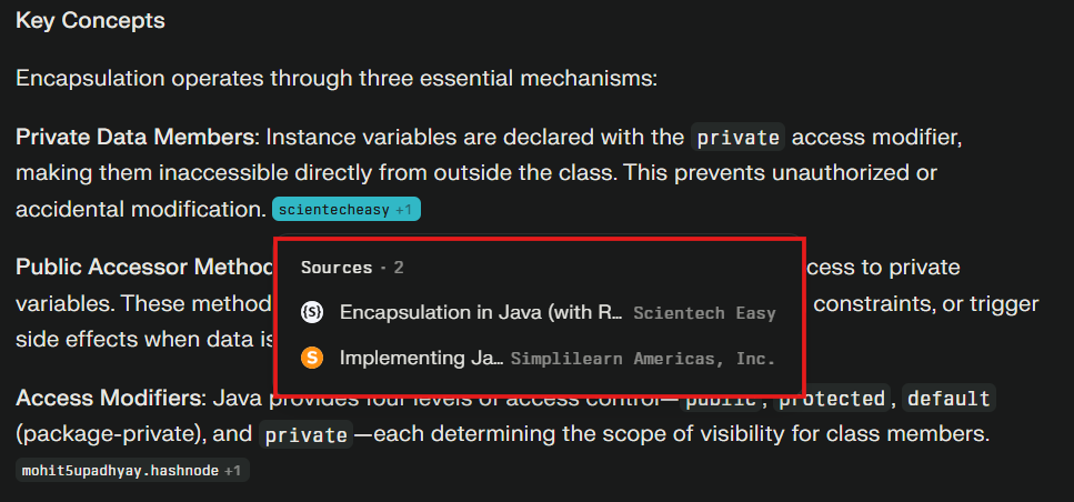 Perplexity in Research Mode is extremely thorough. Its explanations dive deep into encapsulation, covering access modifiers, class structure, and practical benefits. I loved the inline sources. I could hover over almost any sentence to see exactly where the information came from, which is perfect for academic assignments.