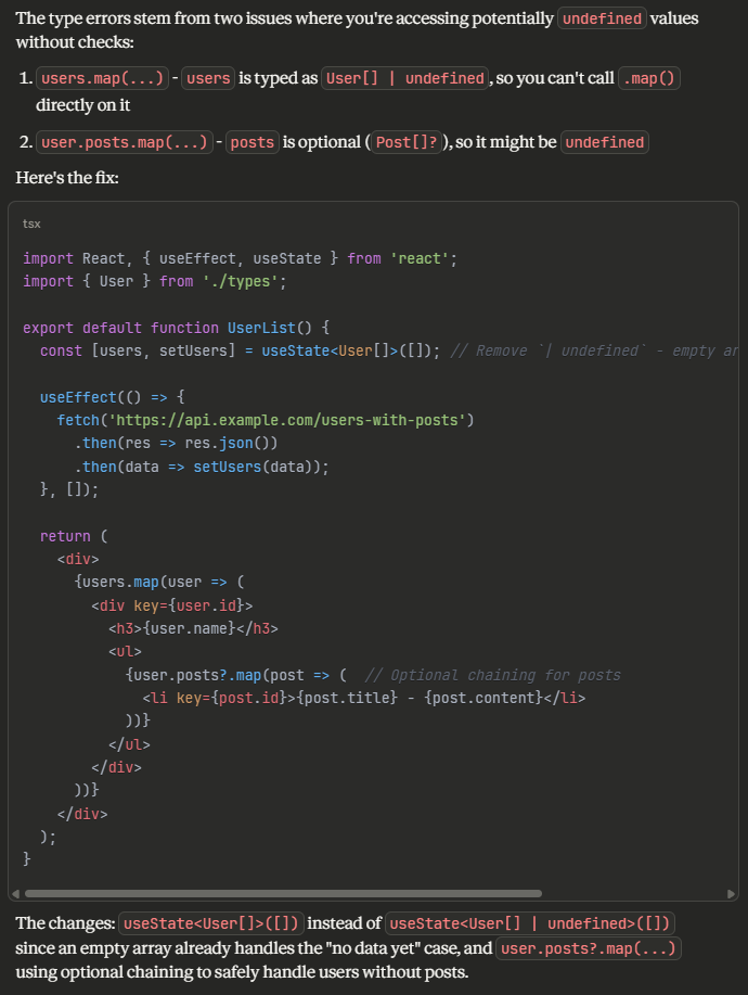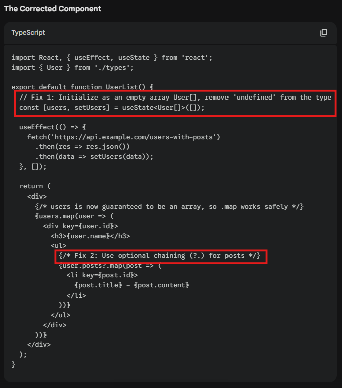 Gemini 3 identified the same optional field issues and provided a fully working component. Its explanation was very detailed, walking through why optional chaining and default values are necessary. However, its code output has too many comments that I need to remove before pasting. The code also lacks syntax coloring, making it harder to read.