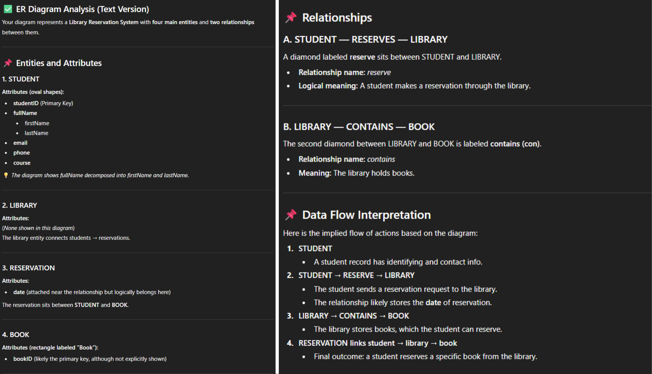 “Here’s a photo of my handwritten ER diagram. Analyze the diagram, identify all entities, relationships, and attributes, explain the data flow, and organize it into a structured, easy-to-read textual format.”