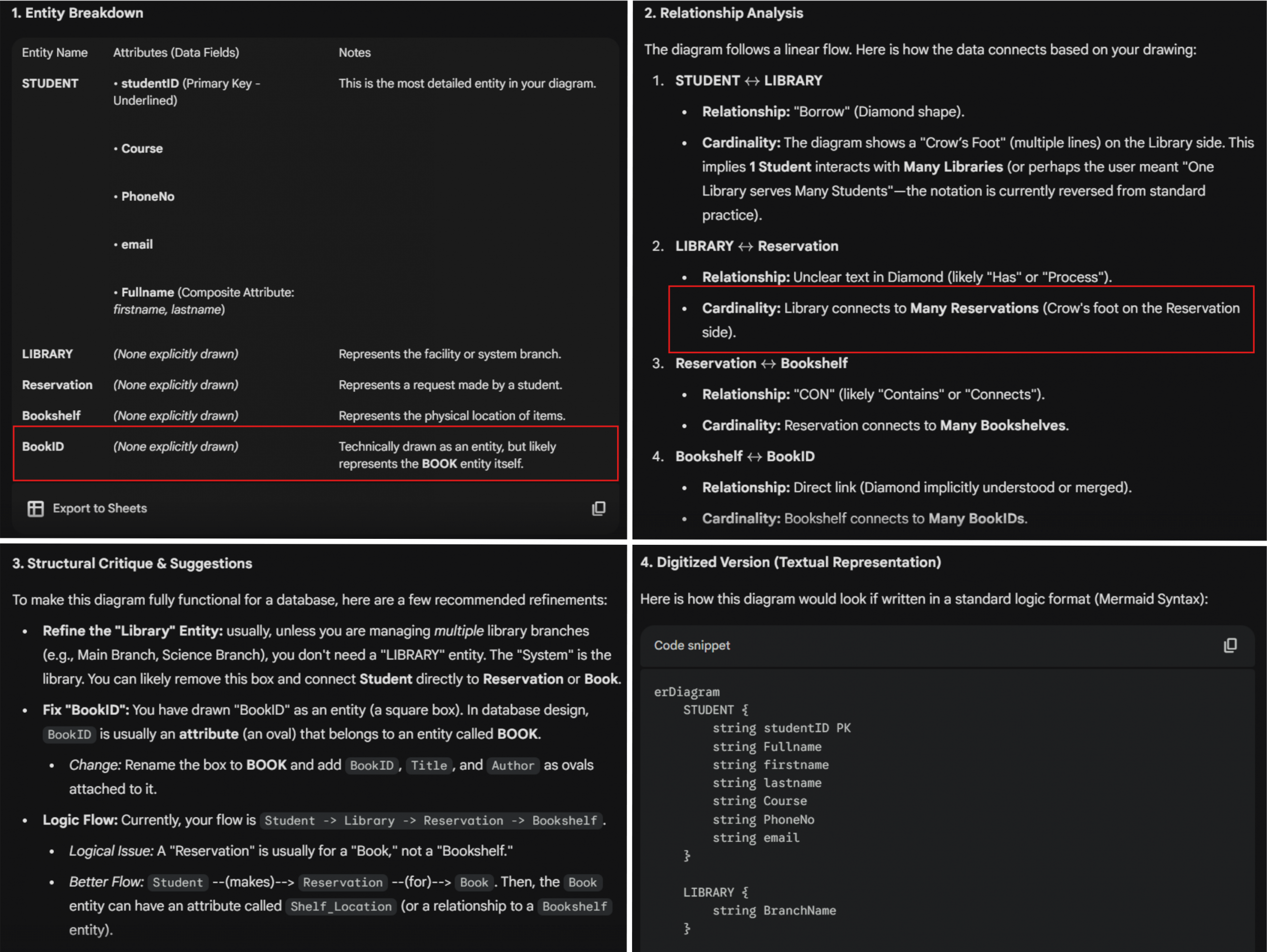 Gemini 3 interpreted my handwritten ER diagram well, correctly identifying entities and attributes and adding the relationships between them. It also provided tips to improve the diagram and produced a textual representation in Mermaid syntax, which I can use directly to generate a digital ER diagram. It did misread “Book” as “BookID,” and I had to wait about 10 seconds for the response. But the inclusion of relationships, improvement suggestions, and Mermaid syntax made its output more actionable.