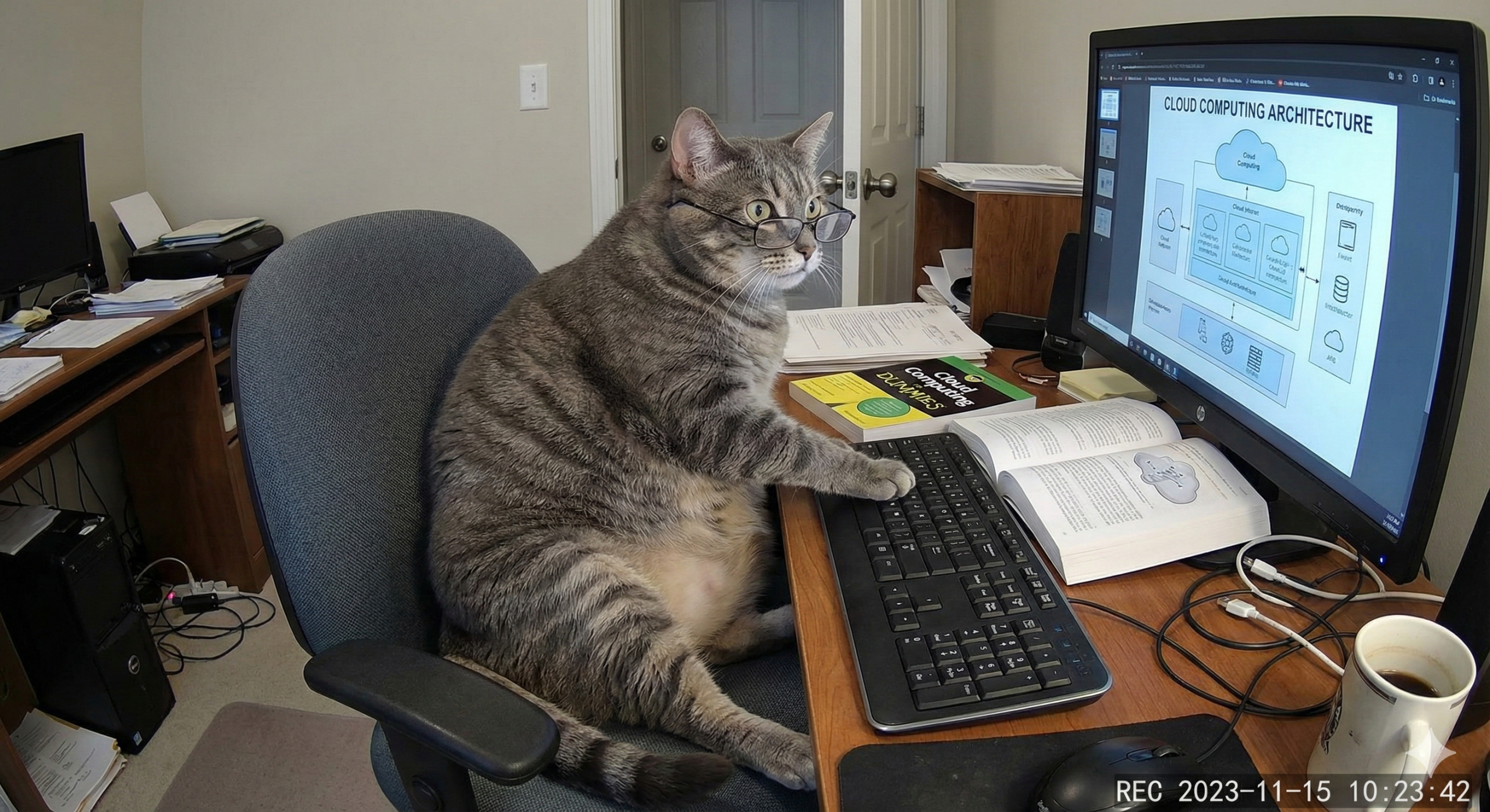 One limitation: Nano Banana Pro still struggles with rendering readable text in complex scenes. In my “cat studying cloud computing caught on CCTV” image, the computer screen showed a cloud diagram with blurred, unreadable text, even though the book on the desk titled “Cloud Computing for Dummies” appeared crisp. But the scene was incredibly detailed. The texture of the cat’s fur, the ambient lighting, and the realistic clutter on the desk were rendered with high definition.