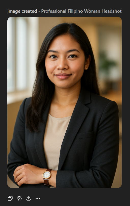 “Create a highly realistic professional headshot of a young Filipino woman in her early 20s, wearing smart-casual business attire, standing in a modern office environment. Include soft natural lighting from a window on the left, subtle background blur (bokeh effect), and a confident yet approachable facial expression. Ensure accurate skin tones, natural hair texture, and realistic reflections in the eyes.”