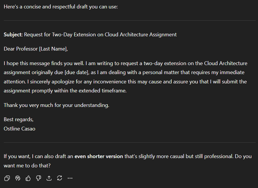 “Write a short, sincere email to my professor requesting a two-day extension on my Cloud Architecture assignment due to a personal matter. Keep it respectful, honest, and concise.”