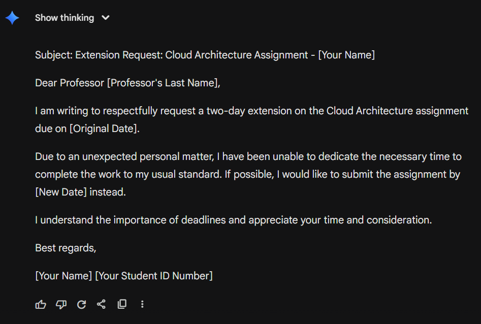 ChatGPT produced output that felt warm and human. The message included a polite apology and reassured the professor, making it feel sincere and approachable. However, it didn’t automatically include fields for a new submission date or my student ID. I’d need to add those manually.