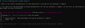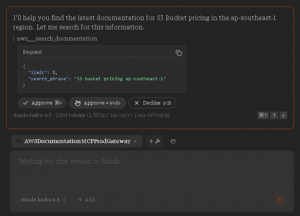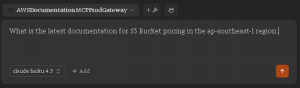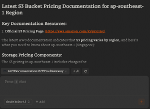 • Once connected, you can start invoking the MCP Server’s tools by using a sample prompt like this: What is the latest documentation for S3 Bucket pricing in the ap-southeast-1 region.