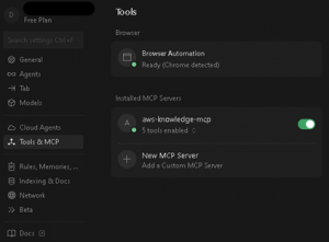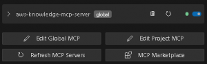 • Once saved, the AWS Knowledge MCP Server should now appear as enabled in your MCP Servers list.