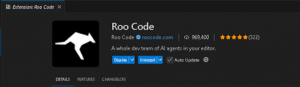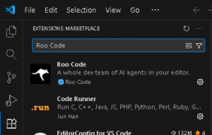 • Open Visual Studio Code (VS Code) and go to the Extensions tab. In the search bar, type “Roo Code”, then click Install to add it to your IDE.