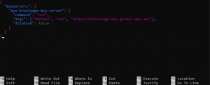• Open or create the mcp.json config file inside the ~/.aws/amazonq/ directory via command: nano ~/.aws/amazonq/mcp.json