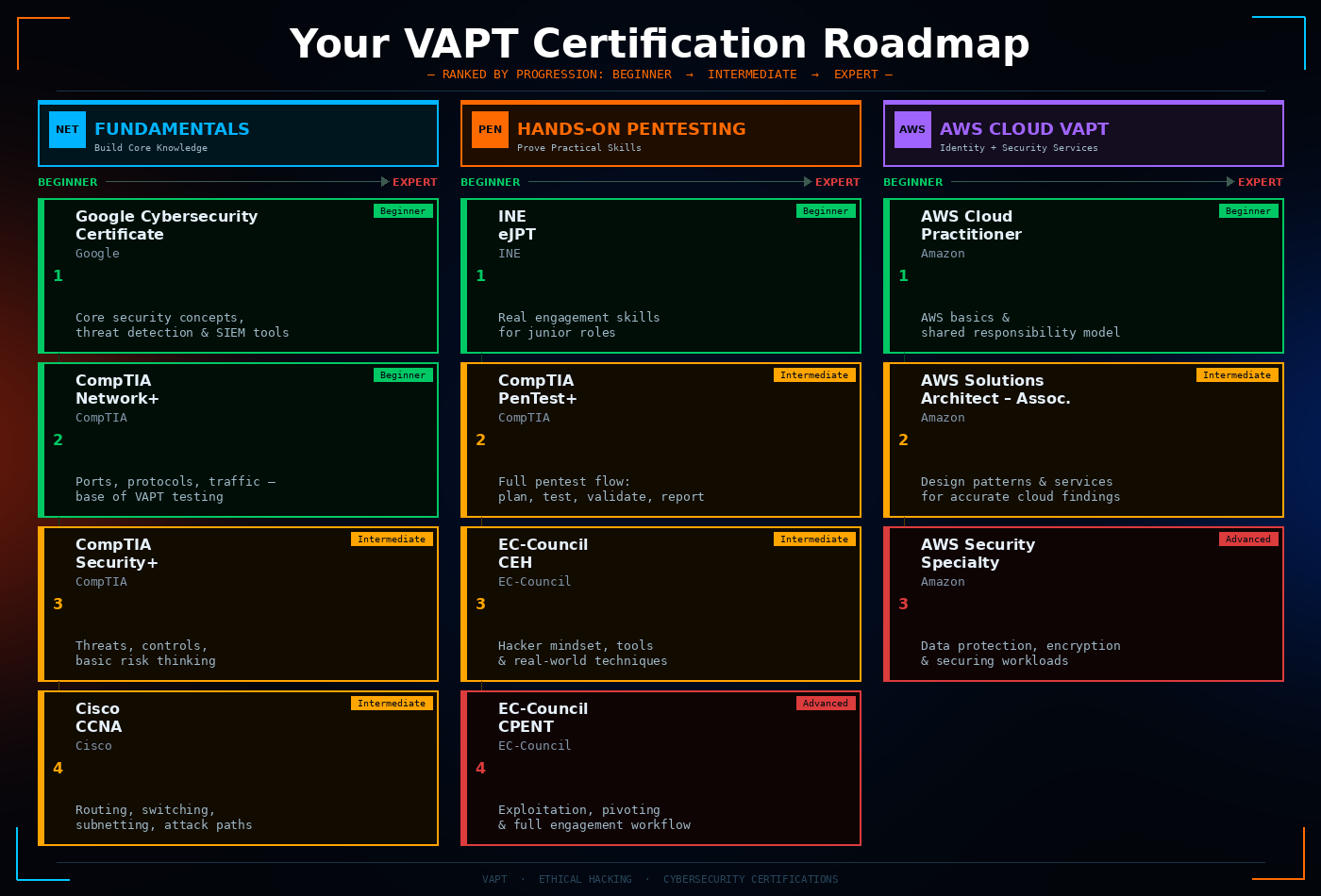 • CompTIA Network+: helps you understand how networks work (ports, protocols, traffic), which is the base of most VAPT testing.