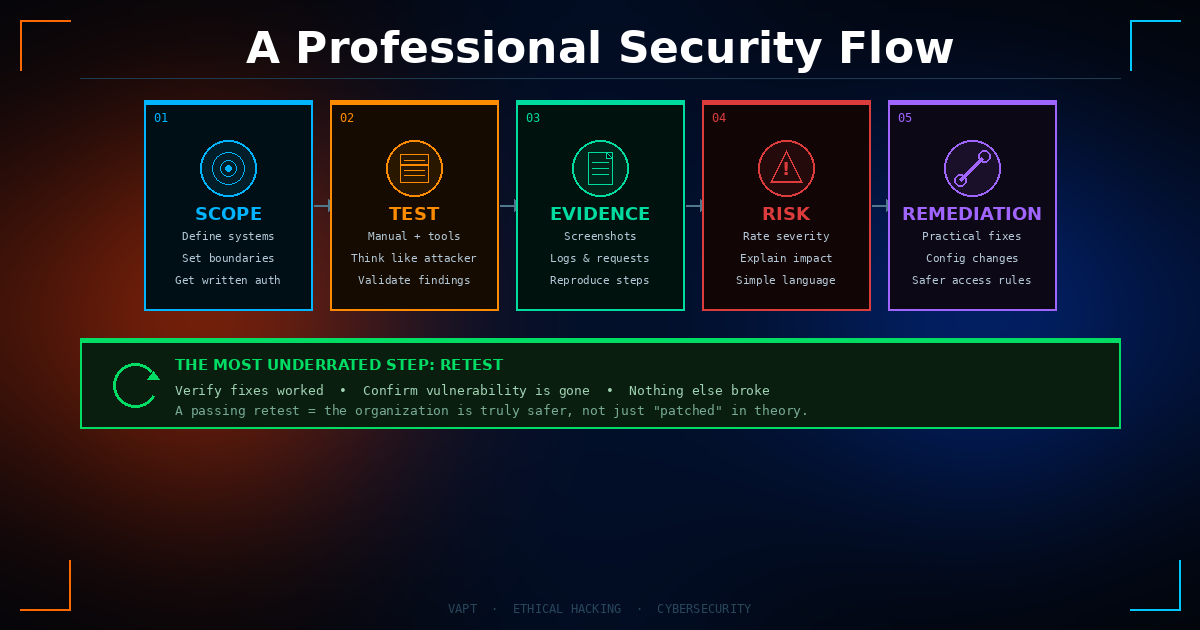 The most underrated step is retest. Many reports look good on paper, but you only know security improved when you verify the fixes worked. A quick retest confirms the vulnerability is gone, nothing else broke, and the organization is truly safer, not just “patched” in theory.